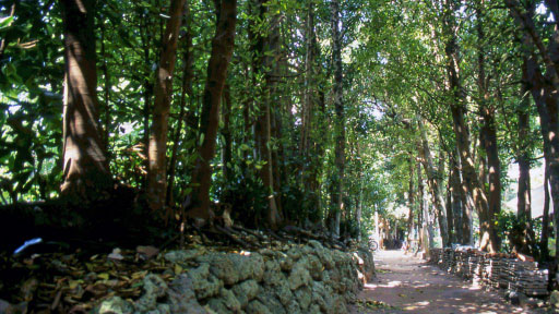 防風林として家を取り囲むように植えられたフクギが連なり、備瀬崎までのおよそ1kmの並木道になっています。